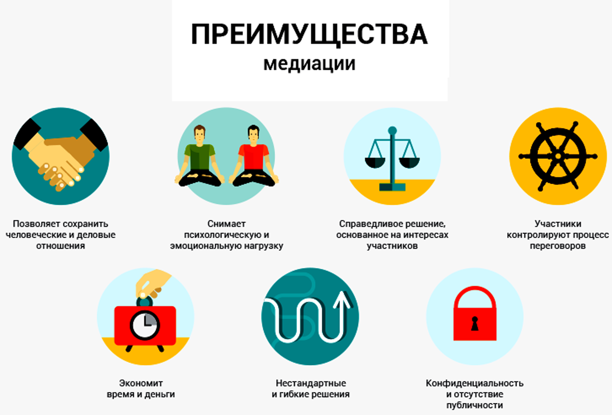 Медиация — это процедура, в ходе которой стороны конфликта пытаются найти общее, устраивающее всех решение при помощи третьего, нейтрального лица – медиатора. Медиатор не принимает решения ни за какую сторону, он только организует процесс переговоров, в ходе которого стороны конфликта могут обсудить претензии друг к другу, обнаружить недостающую информацию, выработать список общих вопросов, подлежащих разрешению и договориться.
